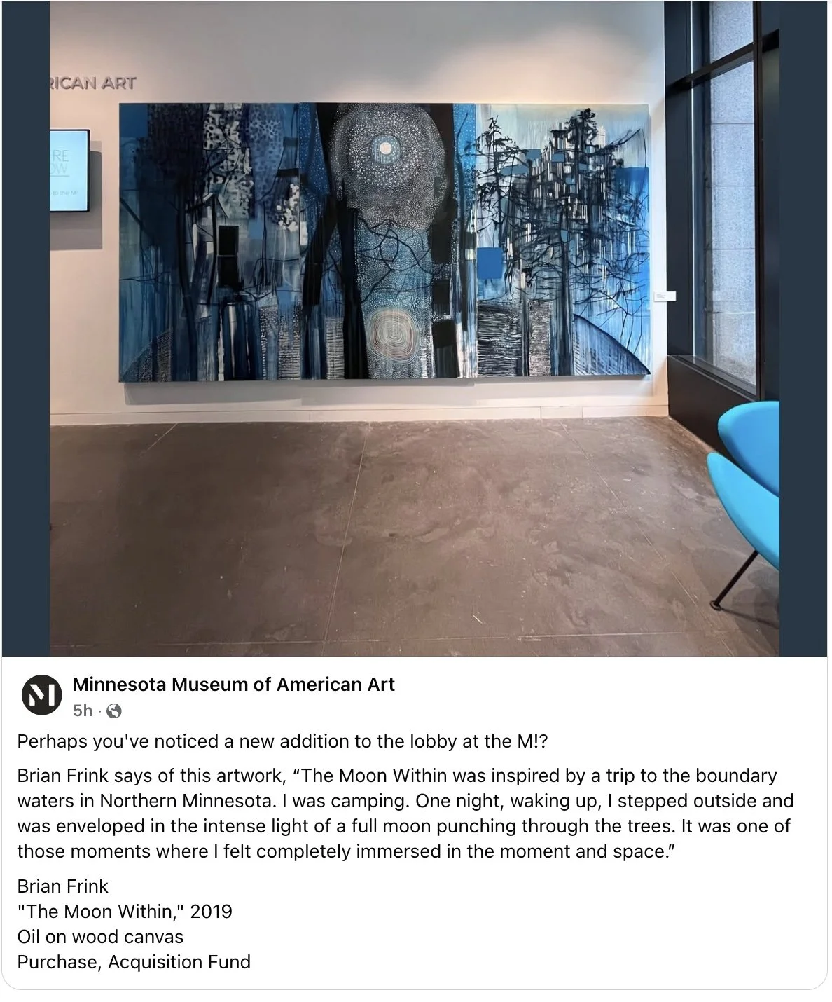The Minnesota Museum of American Art recently purchased my large-scaled painting, The Moon Within, adding it to their permanent collection. I am extremely honored to be included in this important collection of American and Minnesota artists.