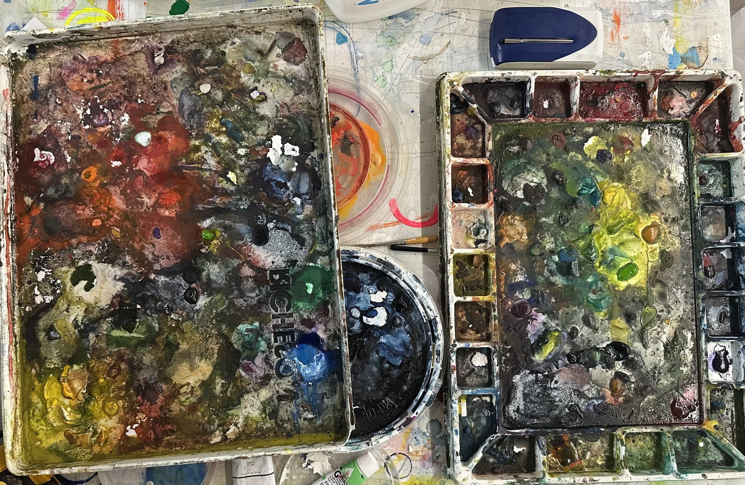 Abstract watercolor painting with overlapping colorful lines and shapes in shades of red, green, yellow, black, and gray.